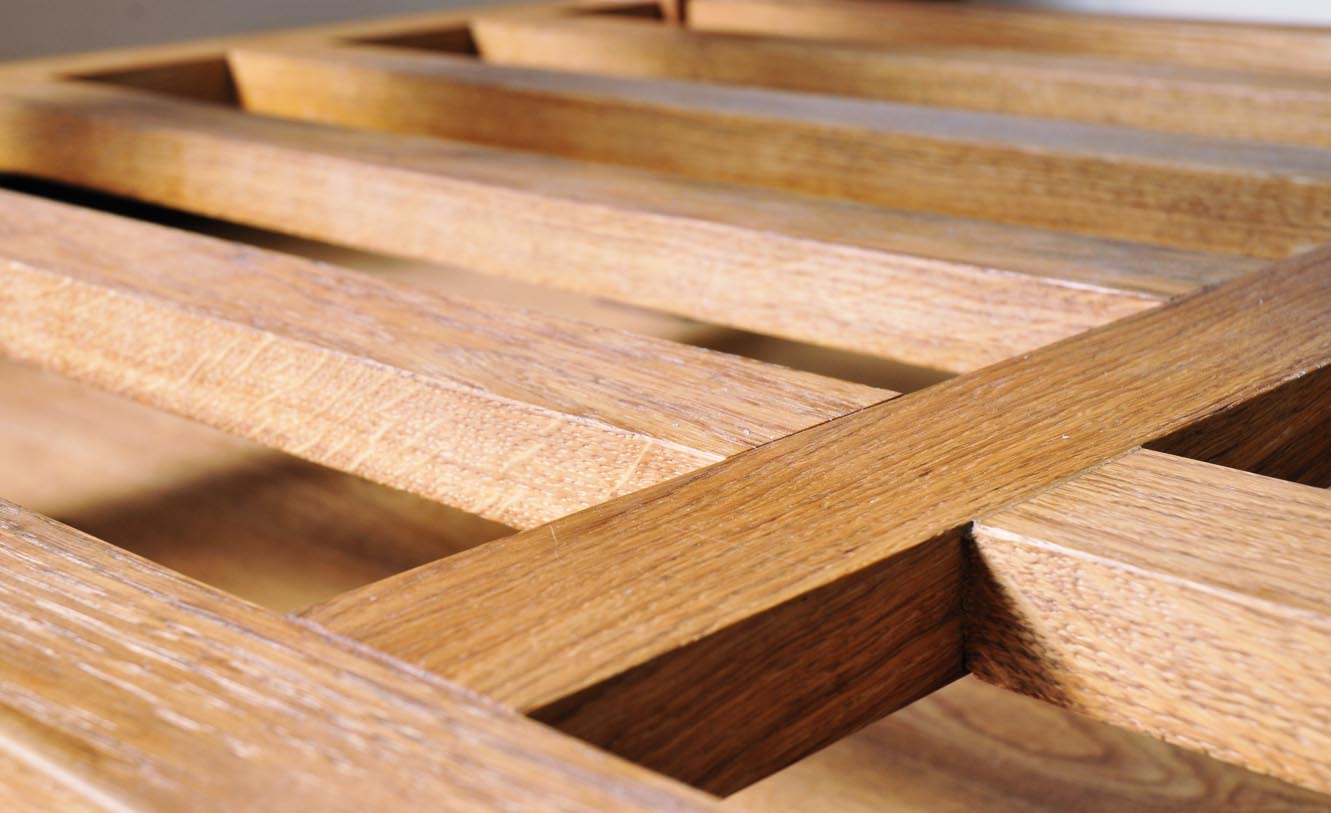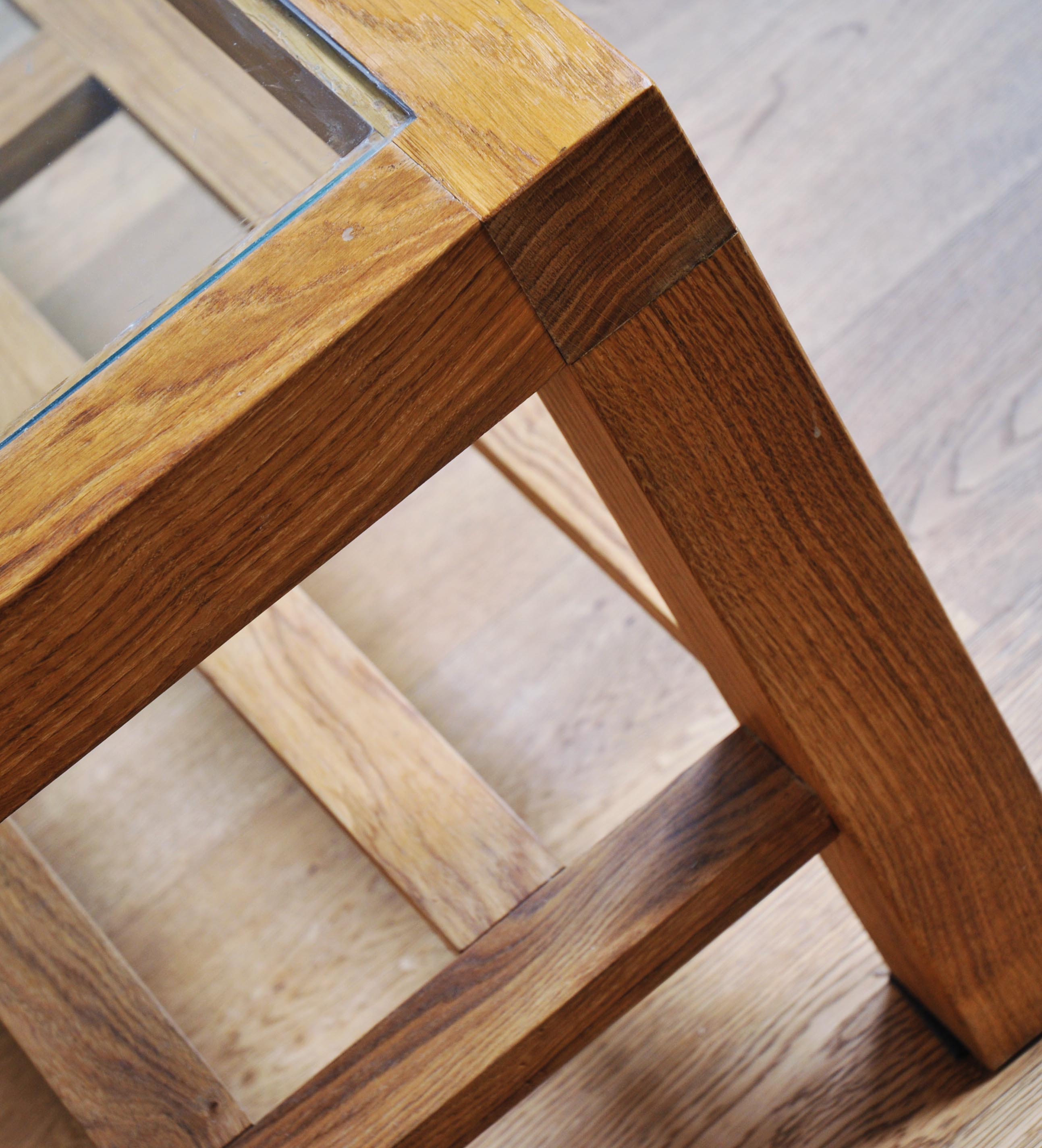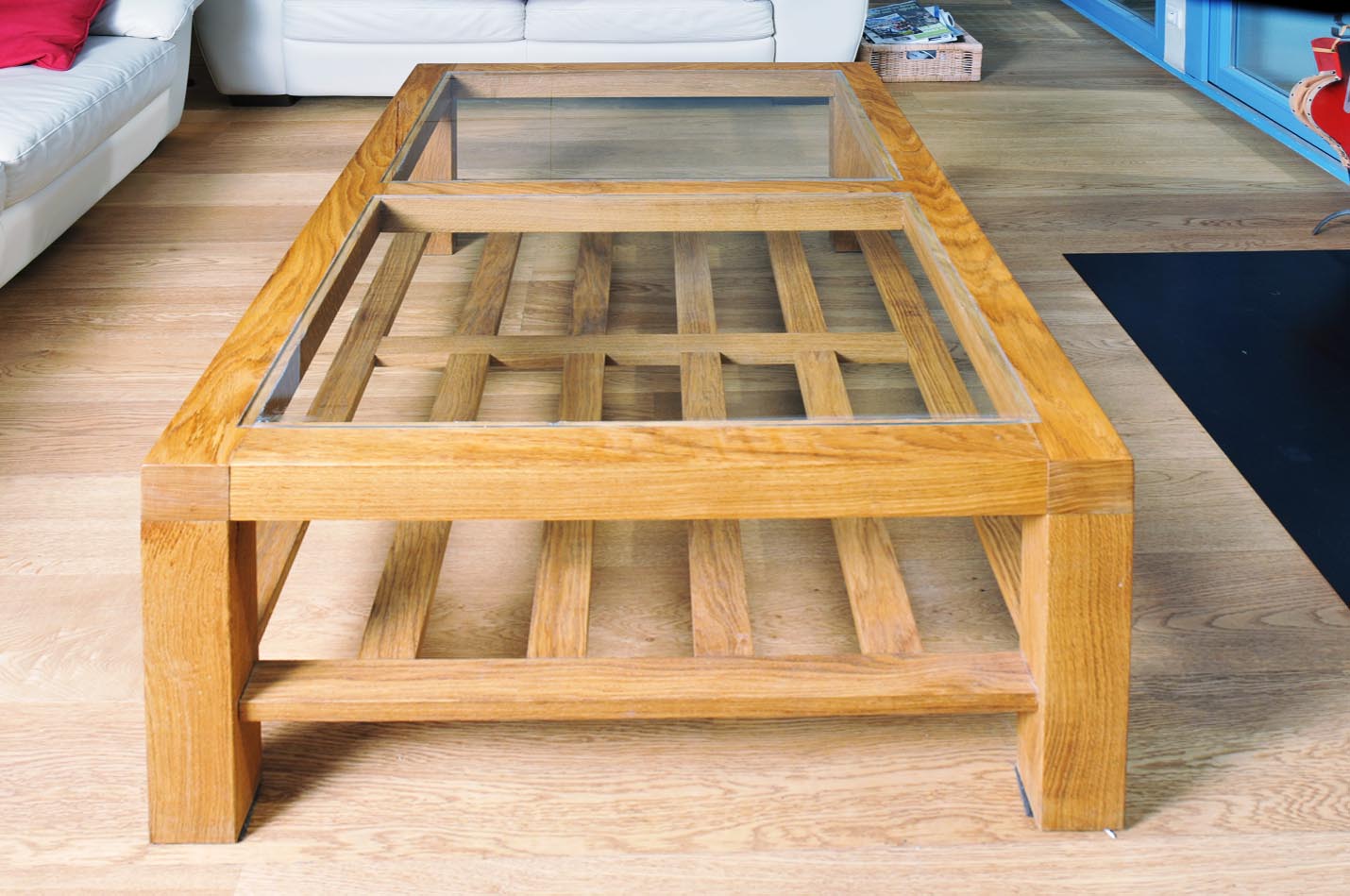 chêne massif et verre « sécurit ». Assemblage traditionnel.