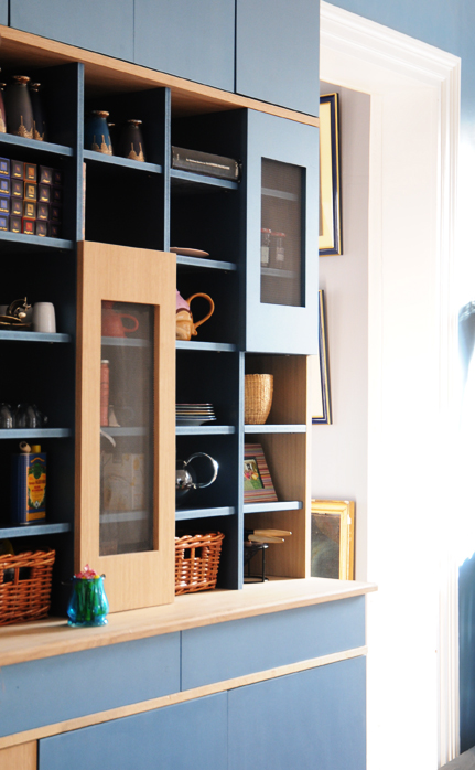 Médium peint, latté chêne pour les portes, et chêne massif pour le plateau et les moulures. Le meuble « épouse » une colonne de descente d’eau. Portes ajourées avec grillage fin.