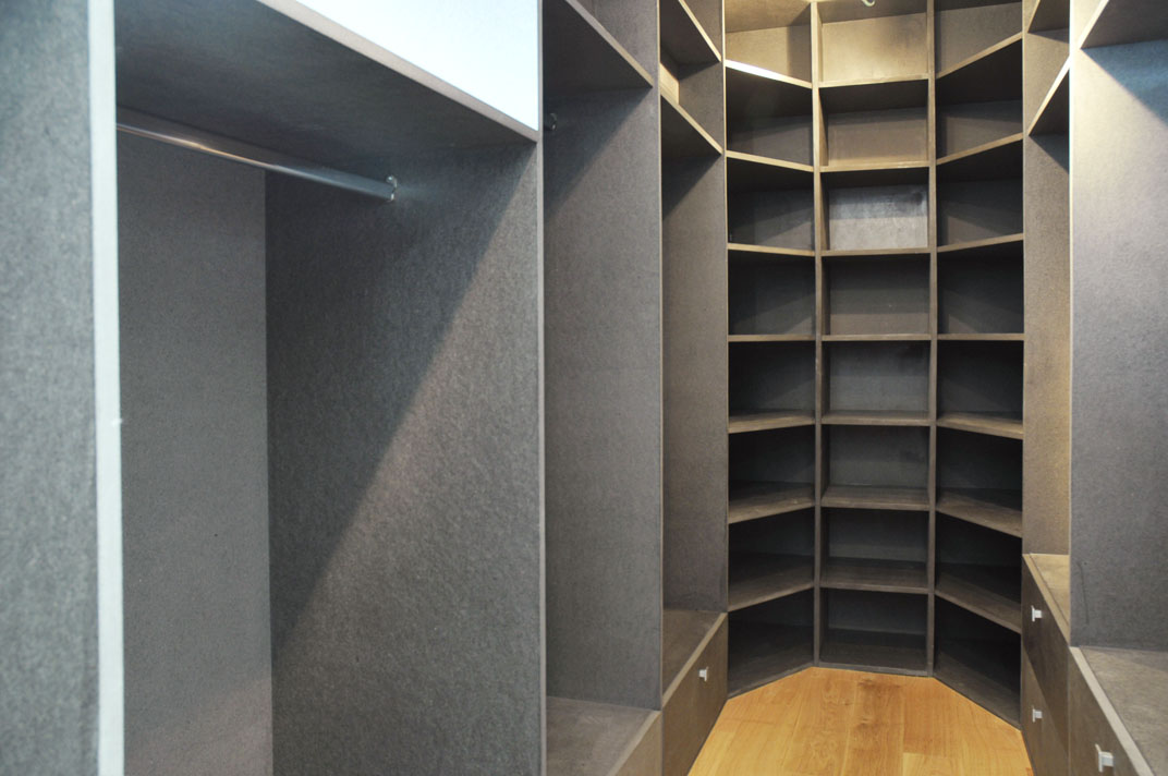 Dressing en médium gris sur mesure, épousant poutres et fenêtres.