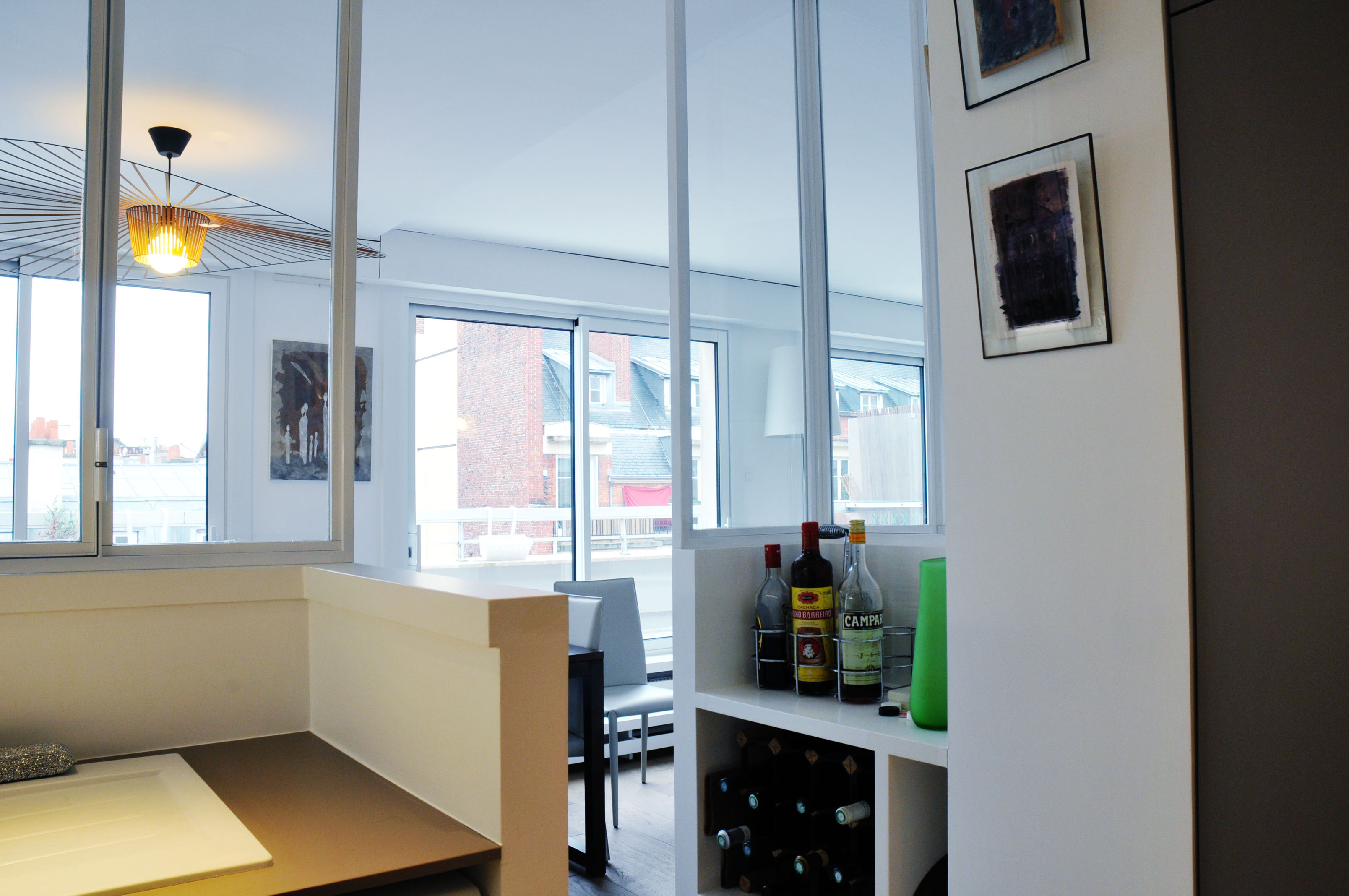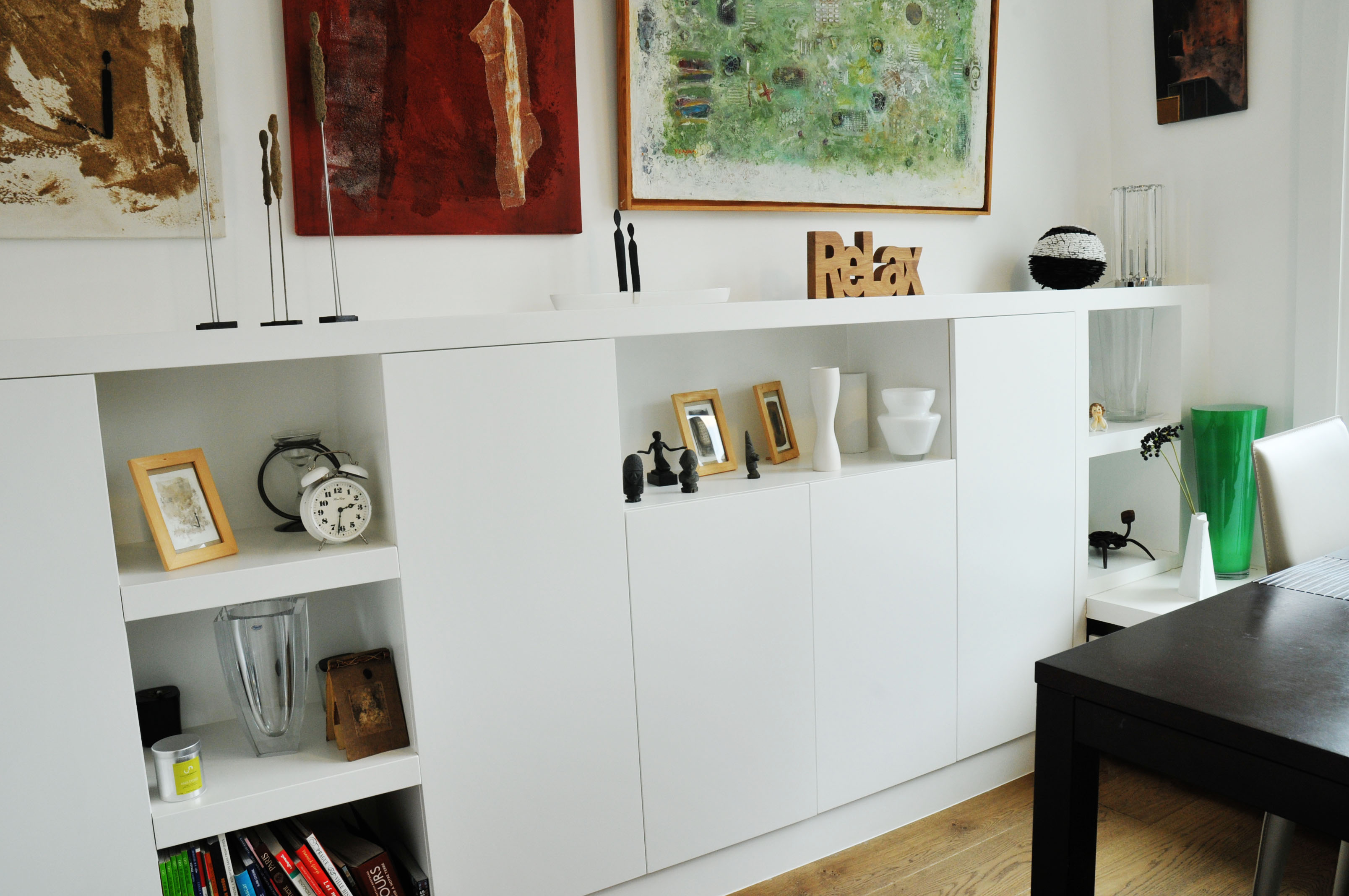 Etagères de 50 mm avec fixation invisible, petit meuble de rangement et meuble de rangement sous un bar. Les portes s’ouvrent par pression. Réalisation en médium peint.