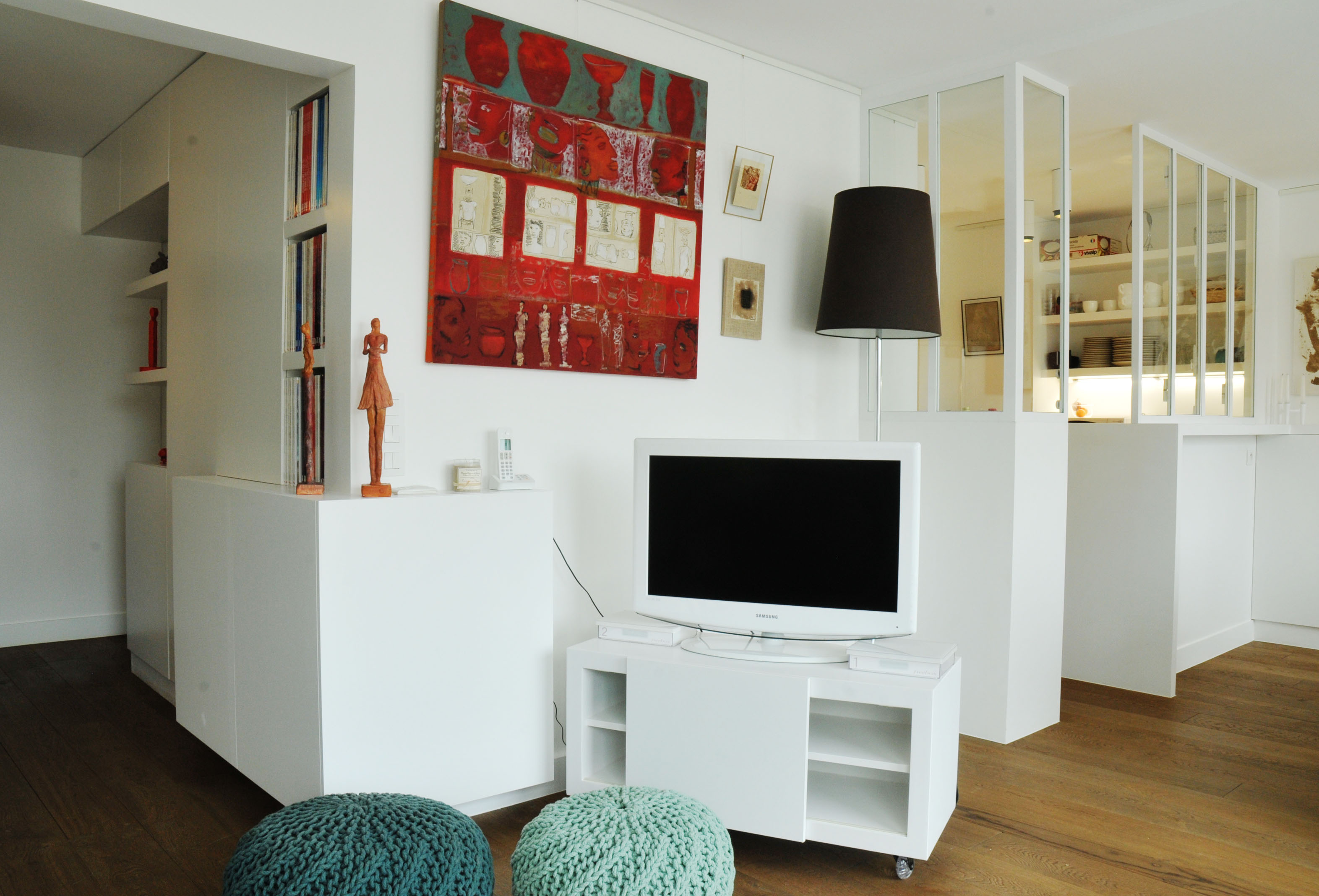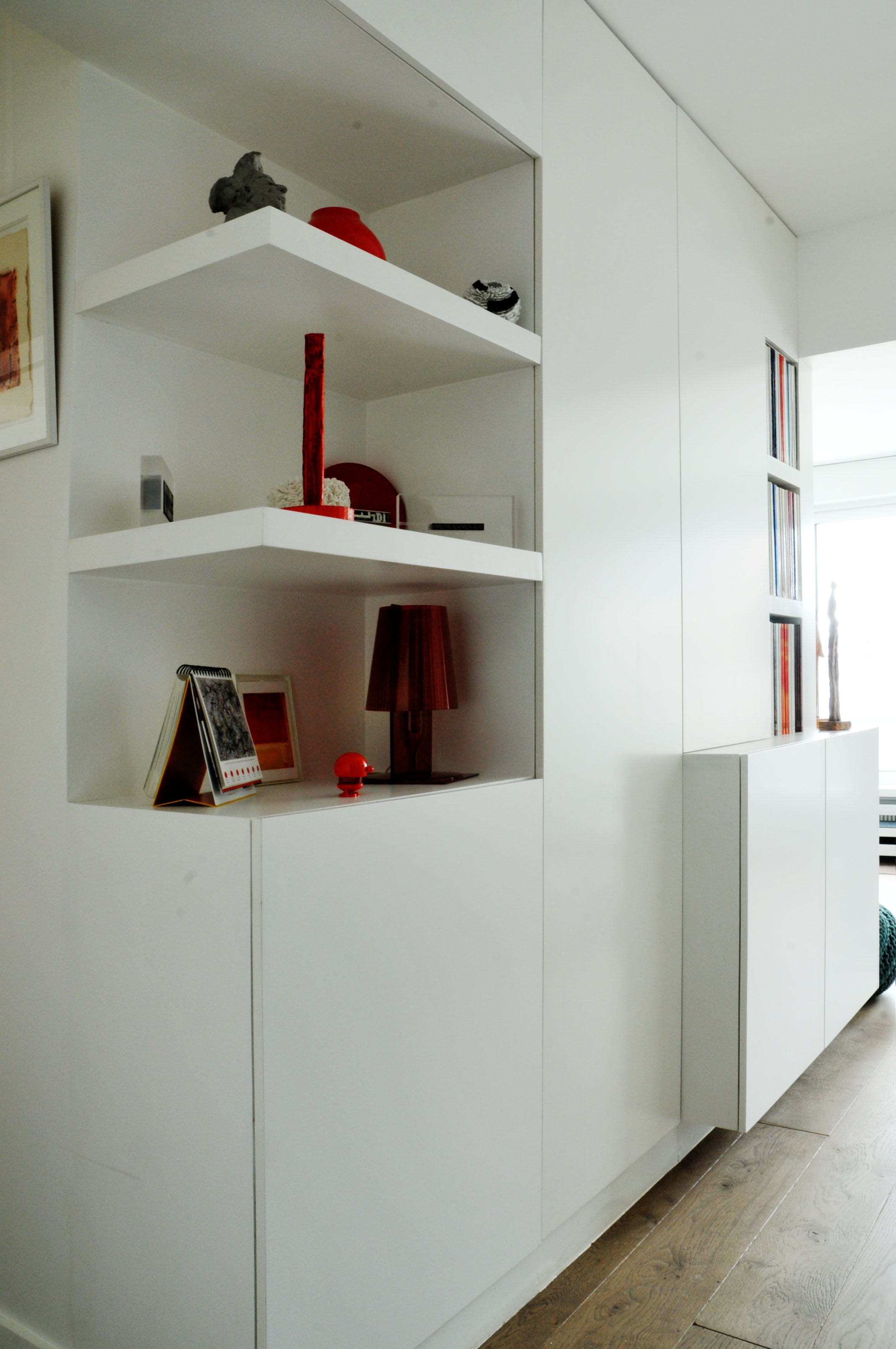 Placard,étagères, dressing et tiroirs sont intégré dans ce meuble d’entrée, en médium peint. Le meuble se retourne dans le salon. Ouverture des portes et tiroirs par pression.