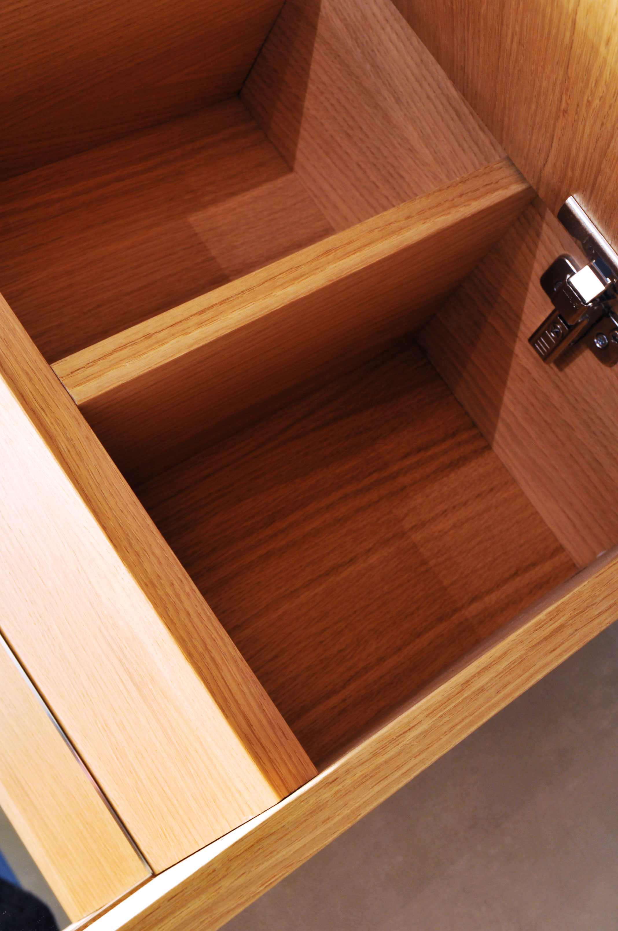 Deux meubles, l’un au dessus de l’autre, celui du haut avec des portes miroitées, celui du bas à trois portes et deux tiroirs. Fabrication en latté chêne vernis.
