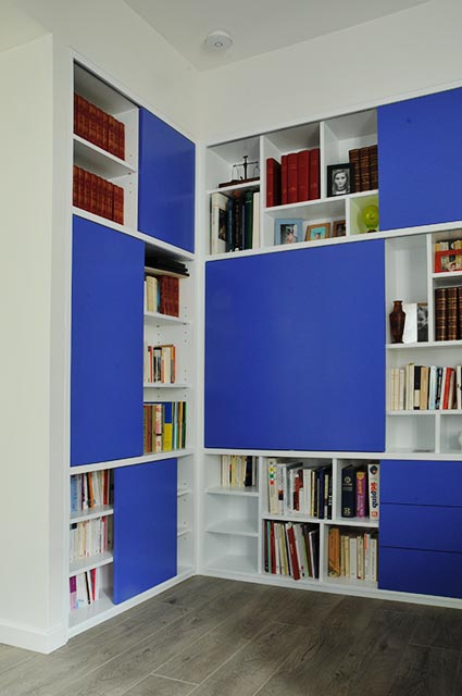 Cloison en médium teinté peint de 19 et 30 mm. Chaque caisson s’ouvre par pression. D.A. : C.Derouen