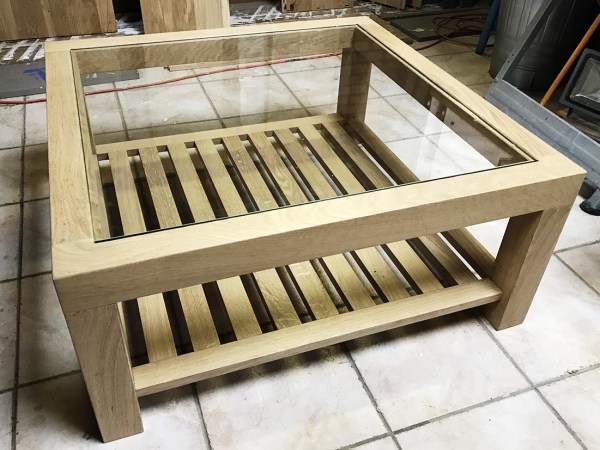Table basse en chêne , 900 X 900 X 450 et verre sécurit. Assemblage invisible , tenon mortaise et colle.