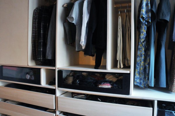 Dressing sur mesure en CP bouleau naturel avec liaisons et angles arrondis. Onze tiroirs à l’anglaise dont cinq avec façade en verre. Barre de dressing en chêne huilé.