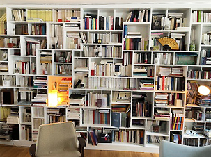 Mur habillé par une bibliothèque de style aléatoire allant jusqu’au plafond. Réalisation en médium peint.