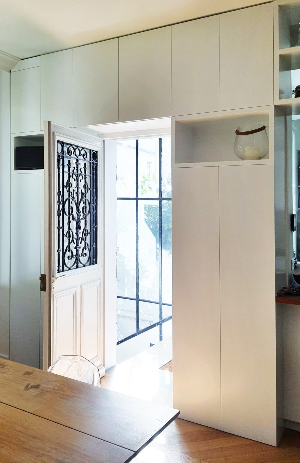 D.A. : Sophie Eberlé/ Atelier 300. Réalisation en médium à peindre d’un meuble dressing encadrant la porte d’entrée de la maison, se poursuivant par un meuble suspendu au dessus de…