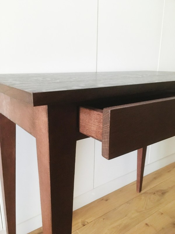 Petit bureau avec un tiroir. Fabrication en chêne teinté.