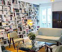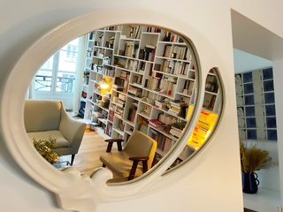 Mur habillé par une bibliothèque de style aléatoire allant jusqu’au plafond.