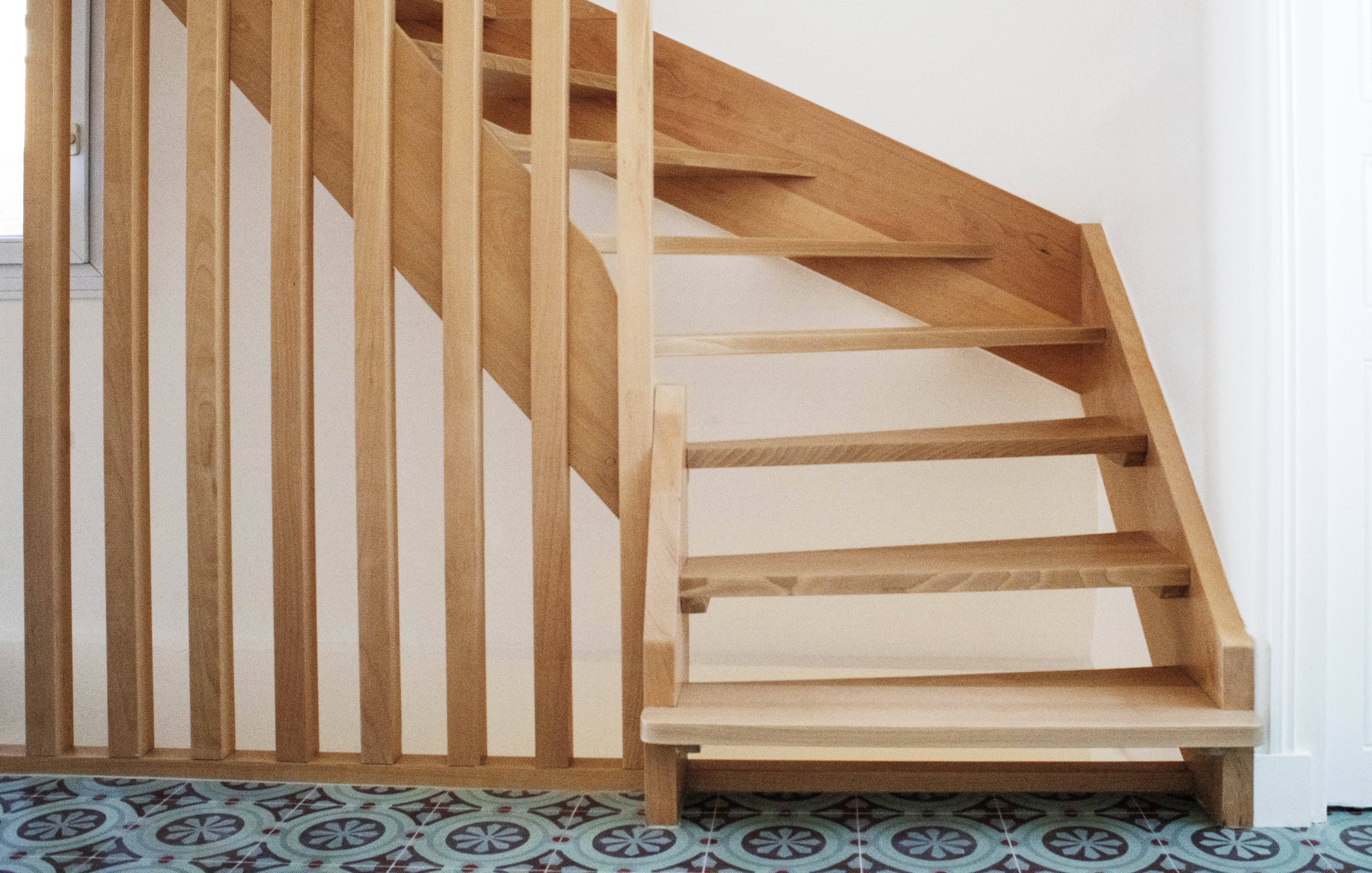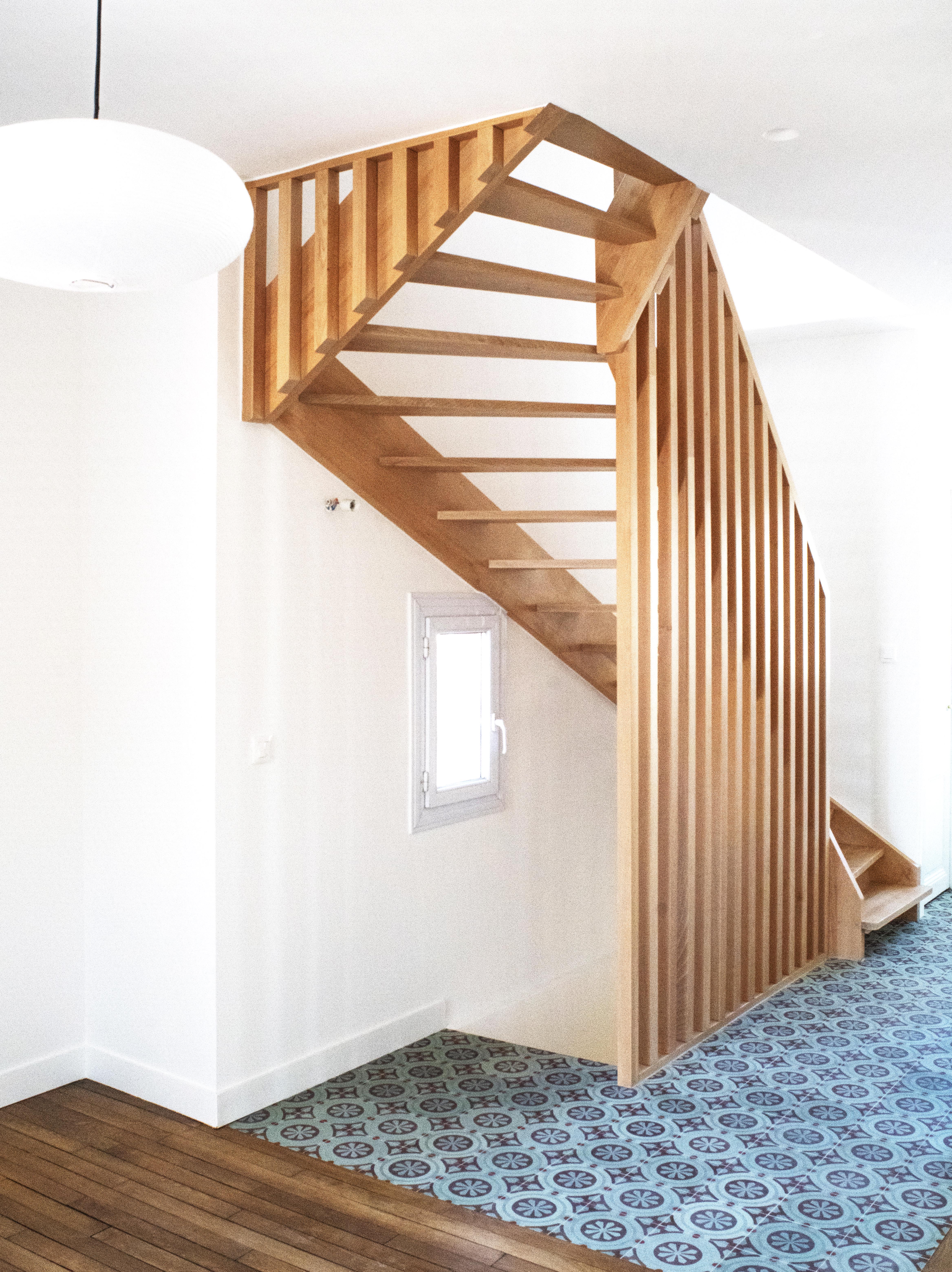 Escalier en hêtre avec garde corps en hêtre.