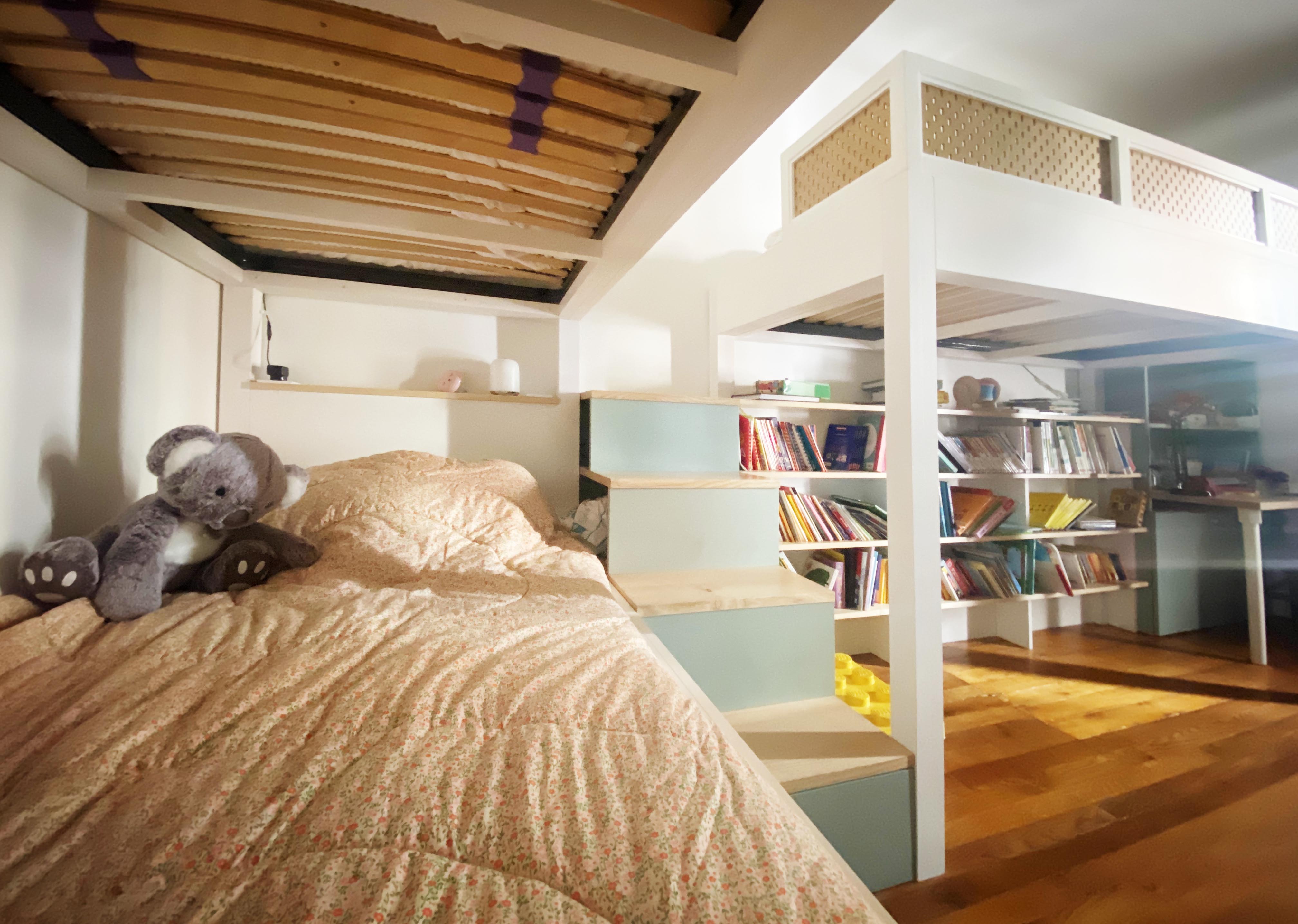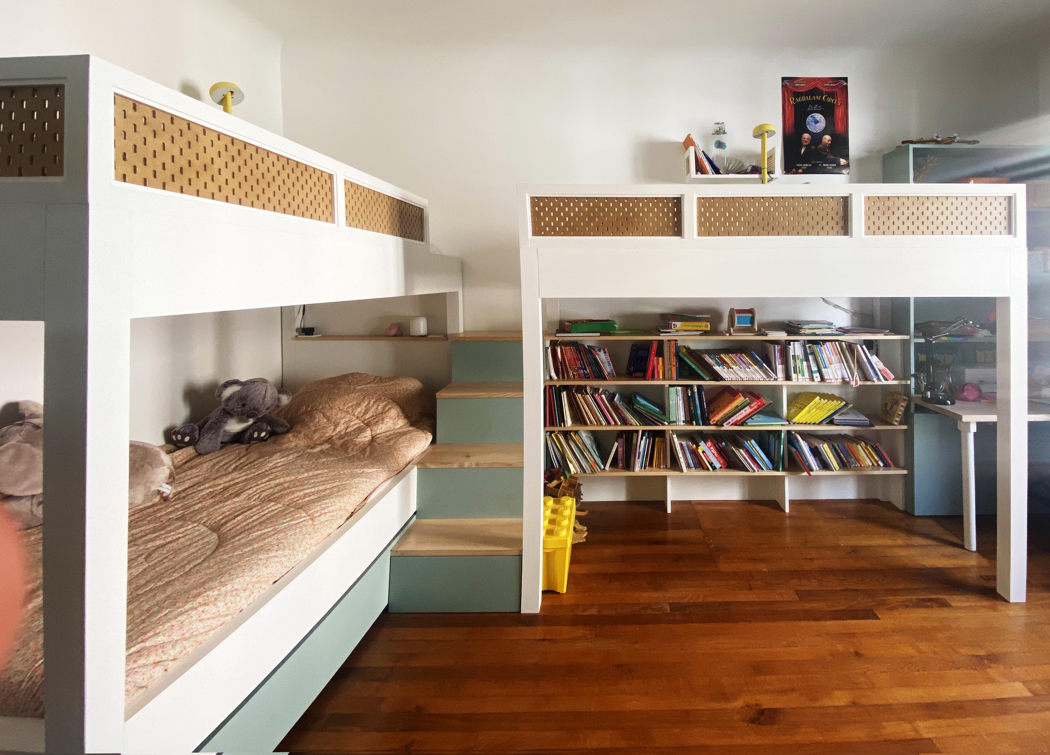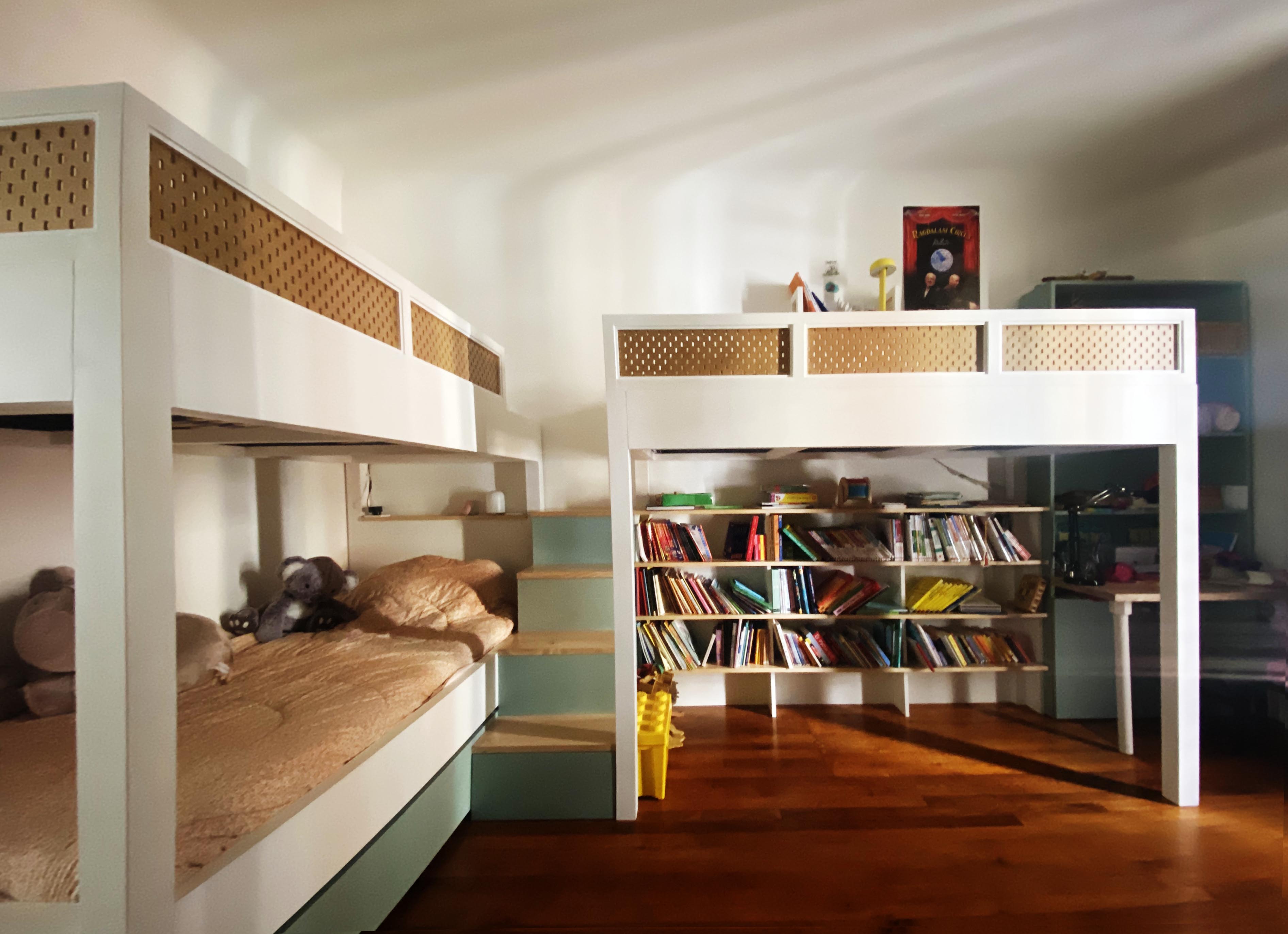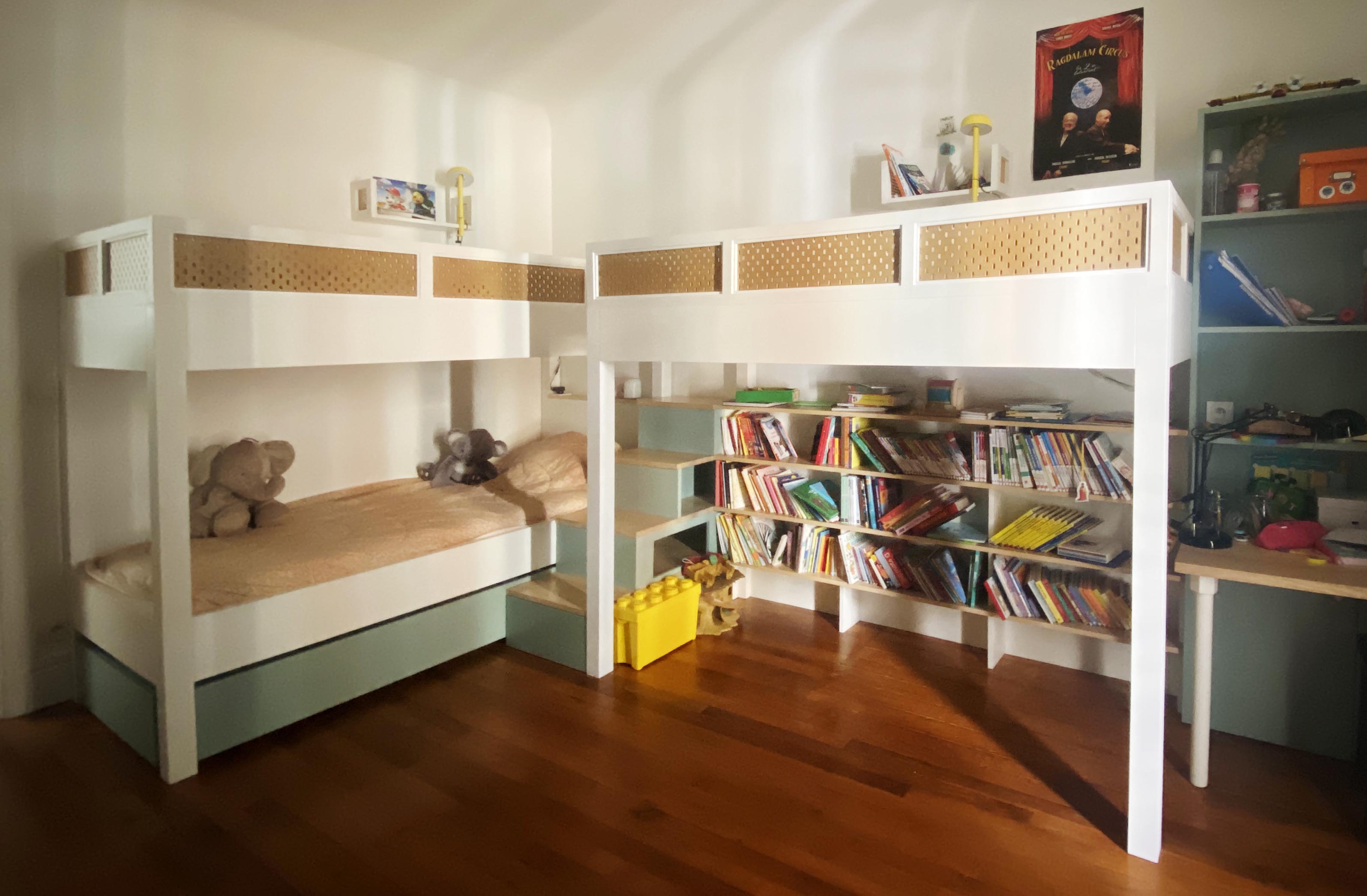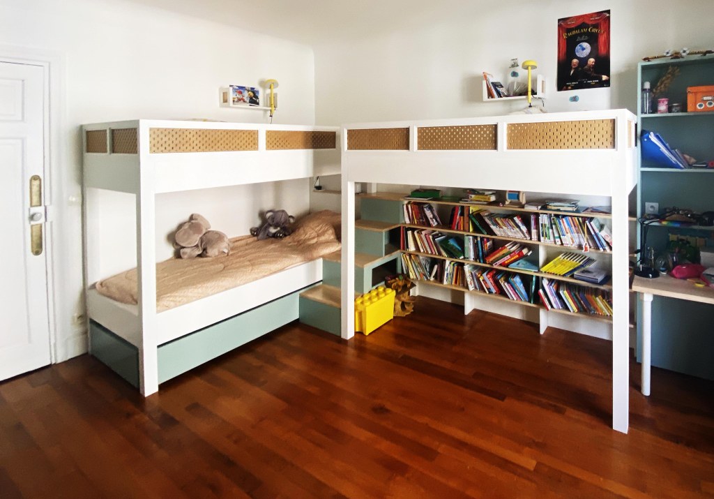 Un lit sur roulettes sous le lit du bas. Quatre couchages en tout.