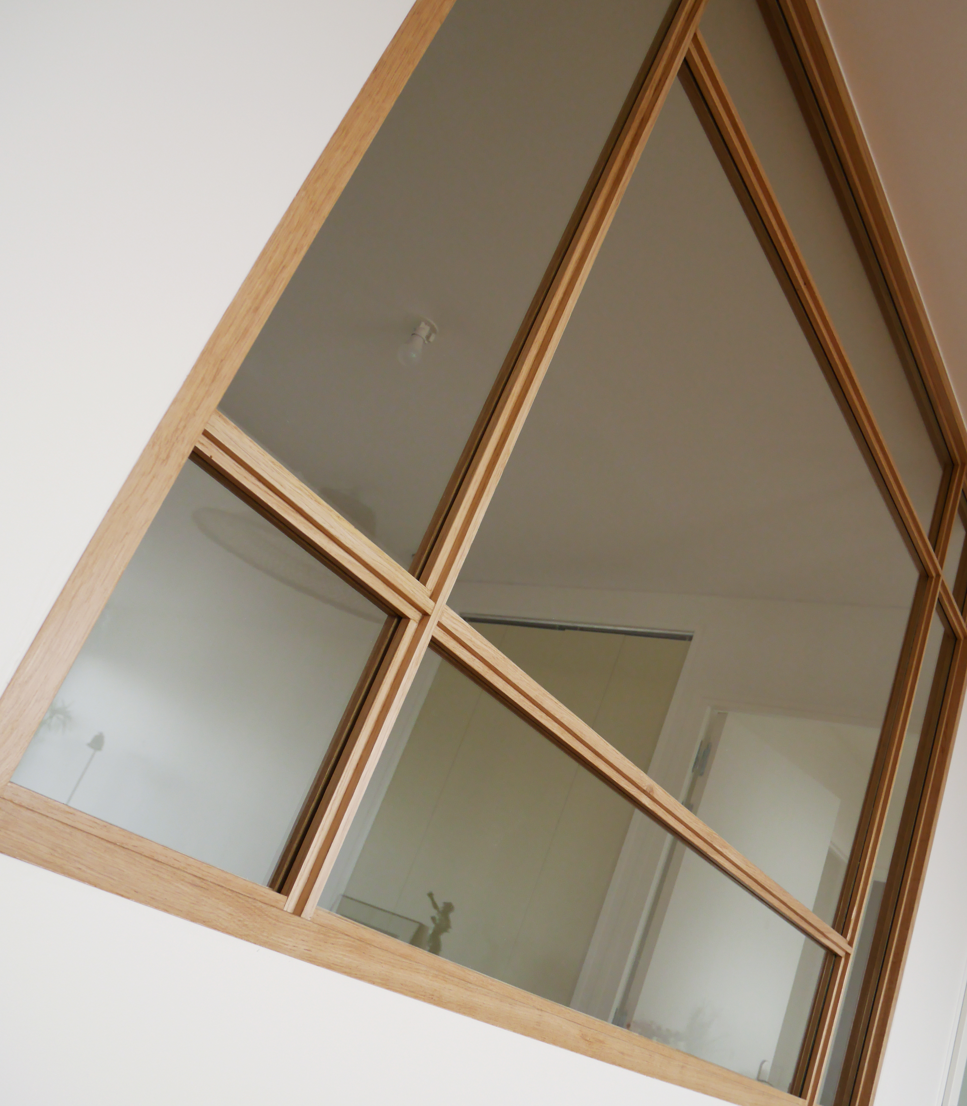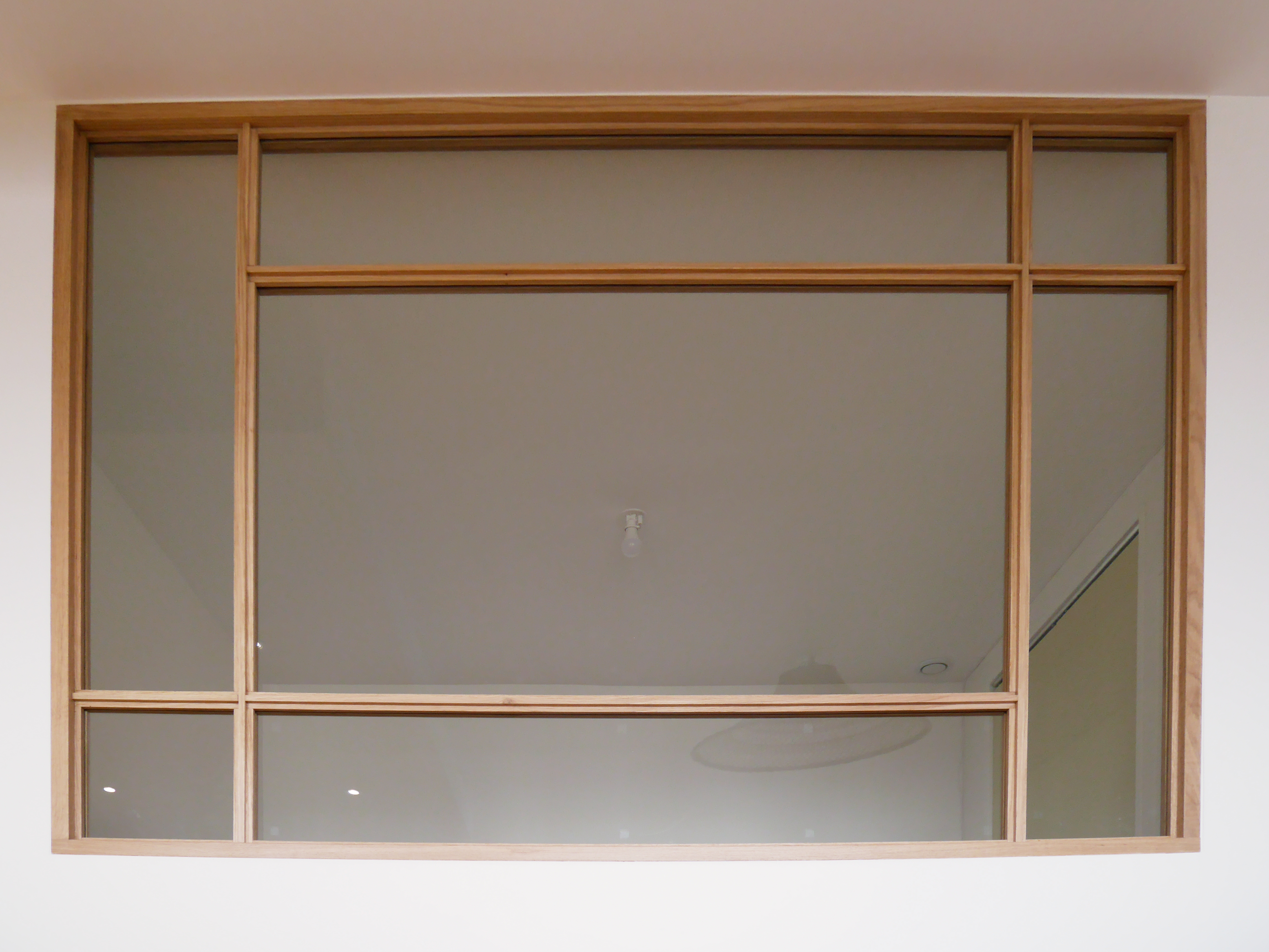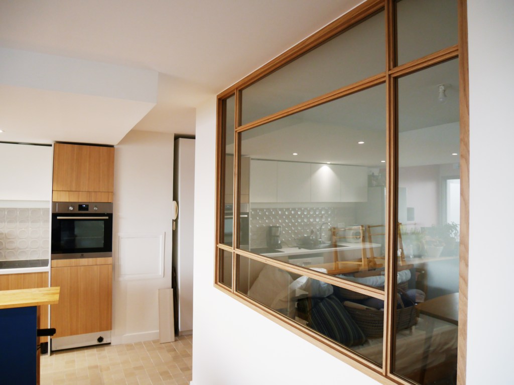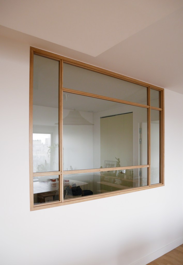 Fabrication d’une verrière sur mesure en chêne. Les montants on été usinés en croix pour alléger visuellement la structure. Le verre est un verre traité anti-bruit. Cette verrière sert de séparation entre la chambre du bébé et le salon.