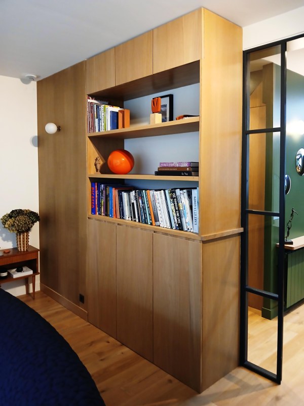 Réalisation d’un dressing bibliothèque qui encadre la porte d’entrée. Réalisation en mélaminé crème.