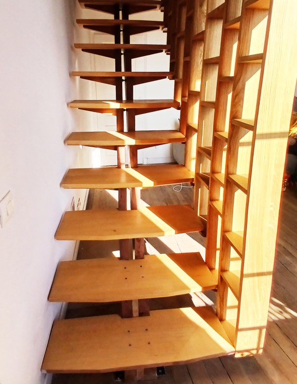 Un garde-corps aux dimensions d’une bibliothèque s’accroche aux marches d’un escalier à limon central. La trémie en partie haute est également protégé par un claustra en chêne.