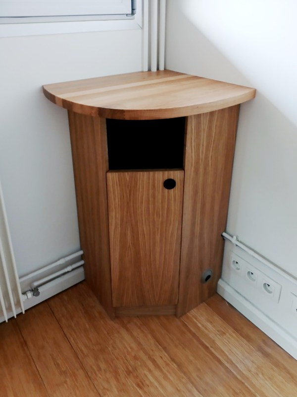 Petit meuble d’angle en chêne. Une porte d’angle permet de cacher les connections internet et box. Intérieur teinté en noir.