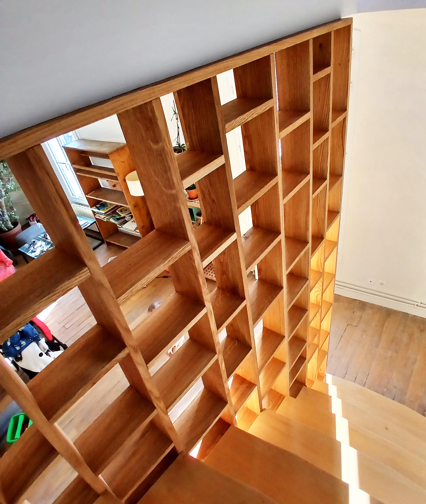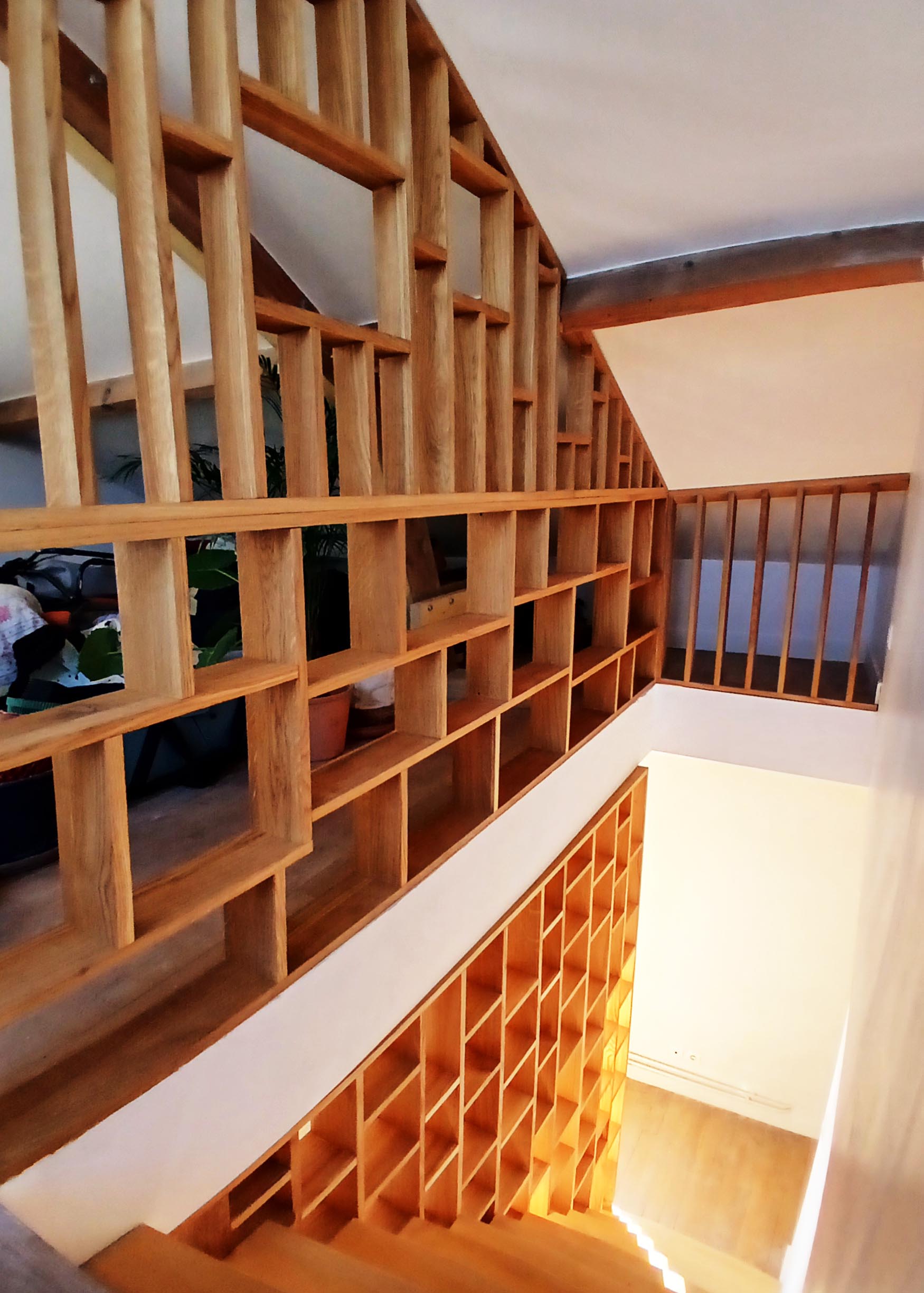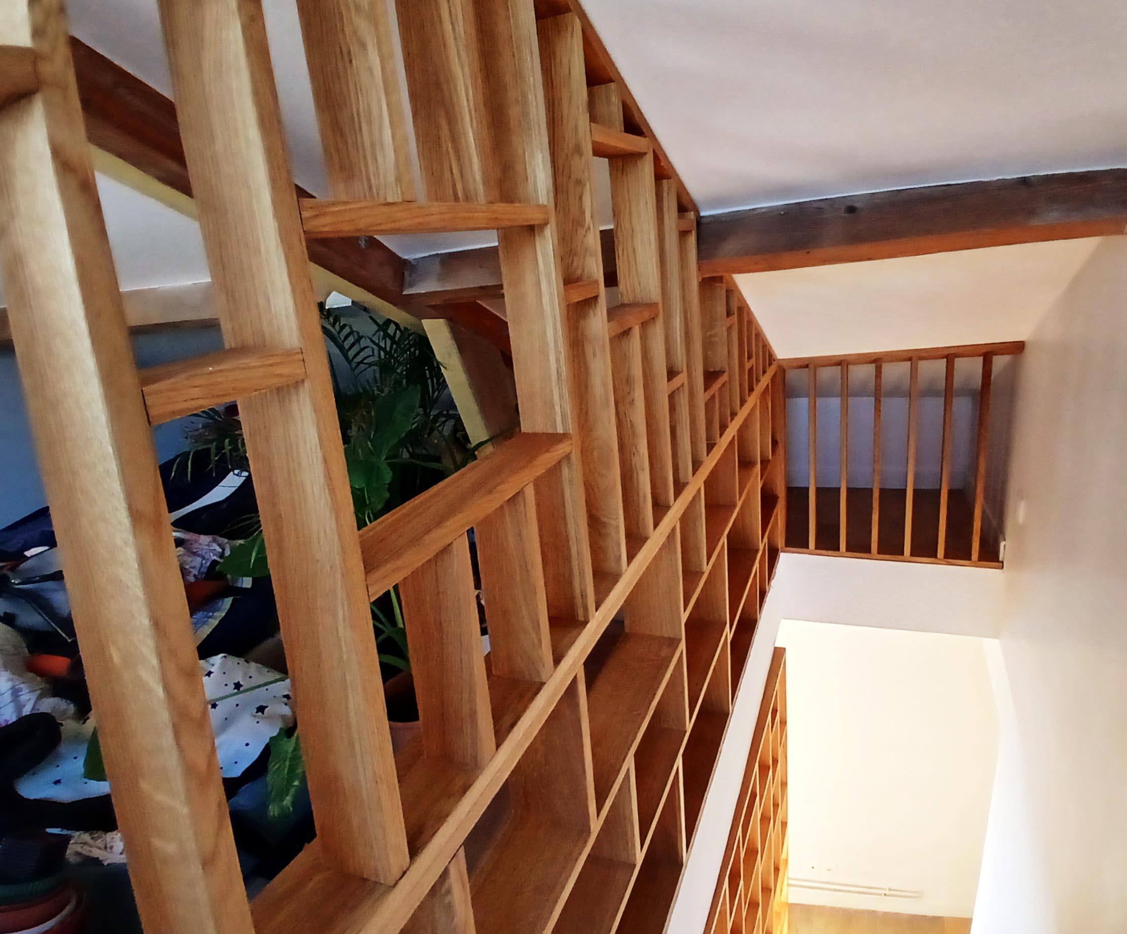 Un garde-corps aux dimensions d’une bibliothèque s’accroche aux marches d’un escalier à limon central. La trémie en partie haute est également protégé par un claustra en chêne.