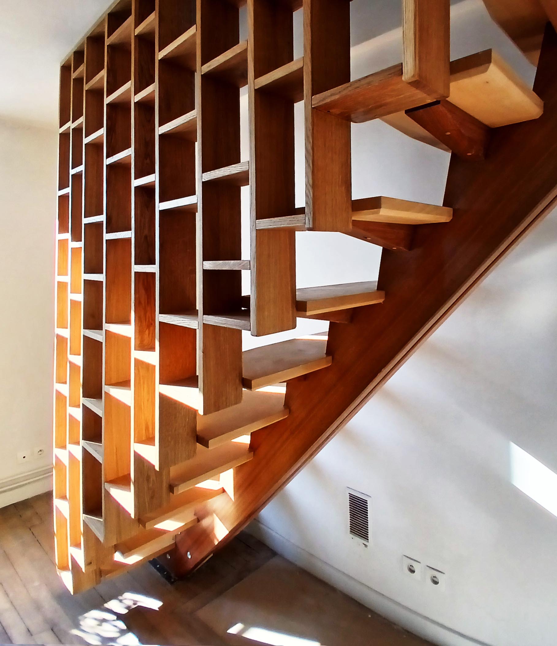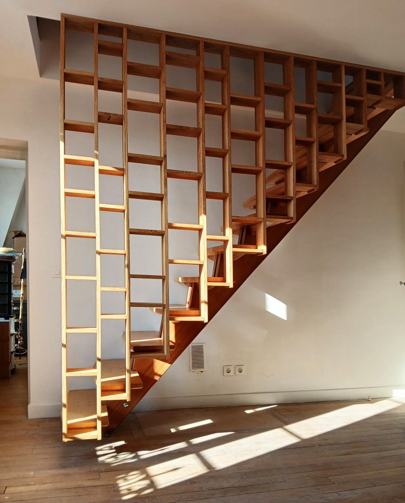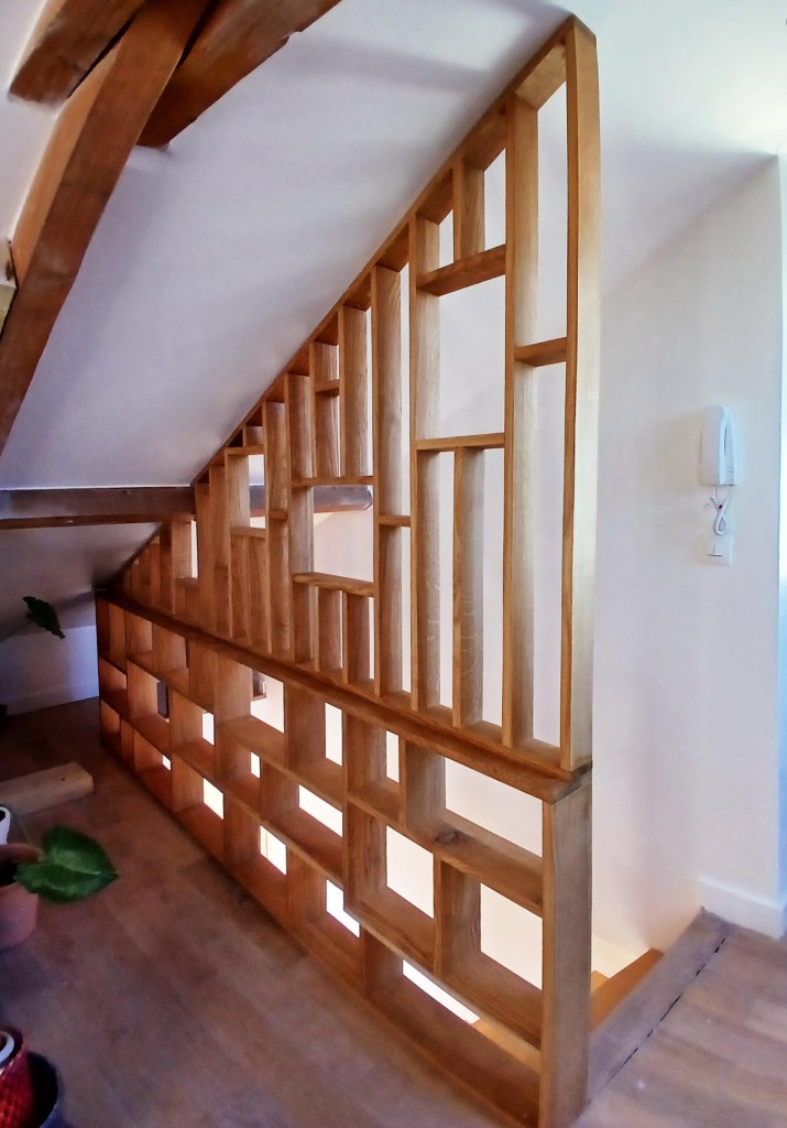 Un garde-corps aux dimensions d’une bibliothèque s’accroche aux marches d’un escalier à limon central. La trémie en partie haute est également protégé par un claustra en chêne.