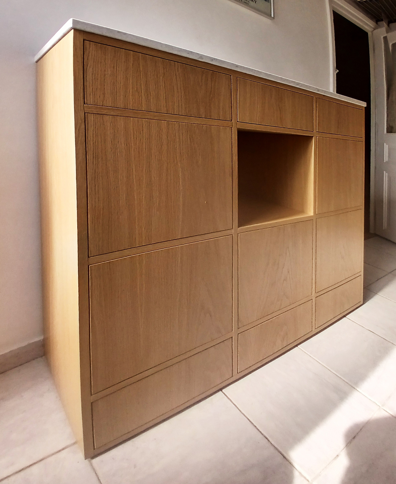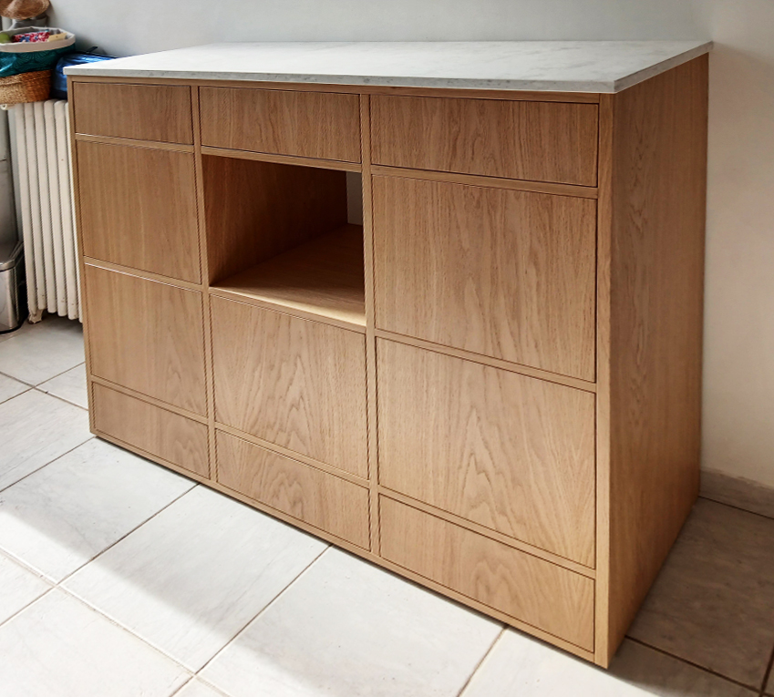 Meuble plaqué chêne, finition vernis. 6 tiroirs, 5 portes et une niche.