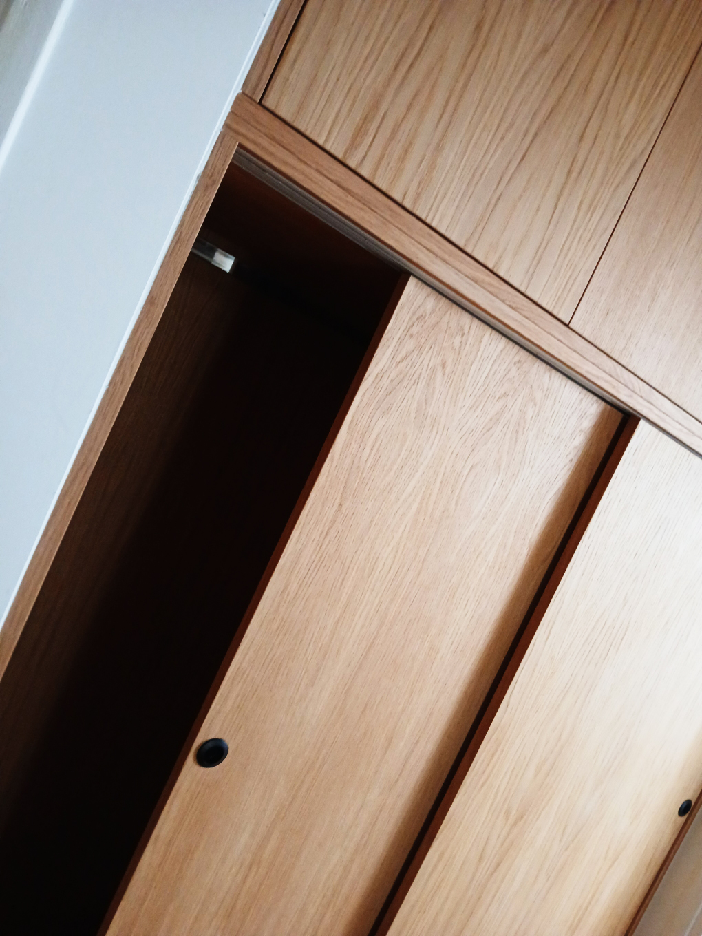 Deux portes coulissantes en partie basse et trois portes pour la partie placard.