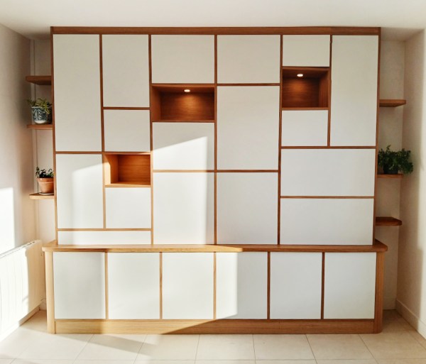 Meuble de salon en chêne, portes en Soft-touch blanc. Un coin bureau est intégré, un espace télé est caché par les portes du milieu. Les côtés de la partie basse…