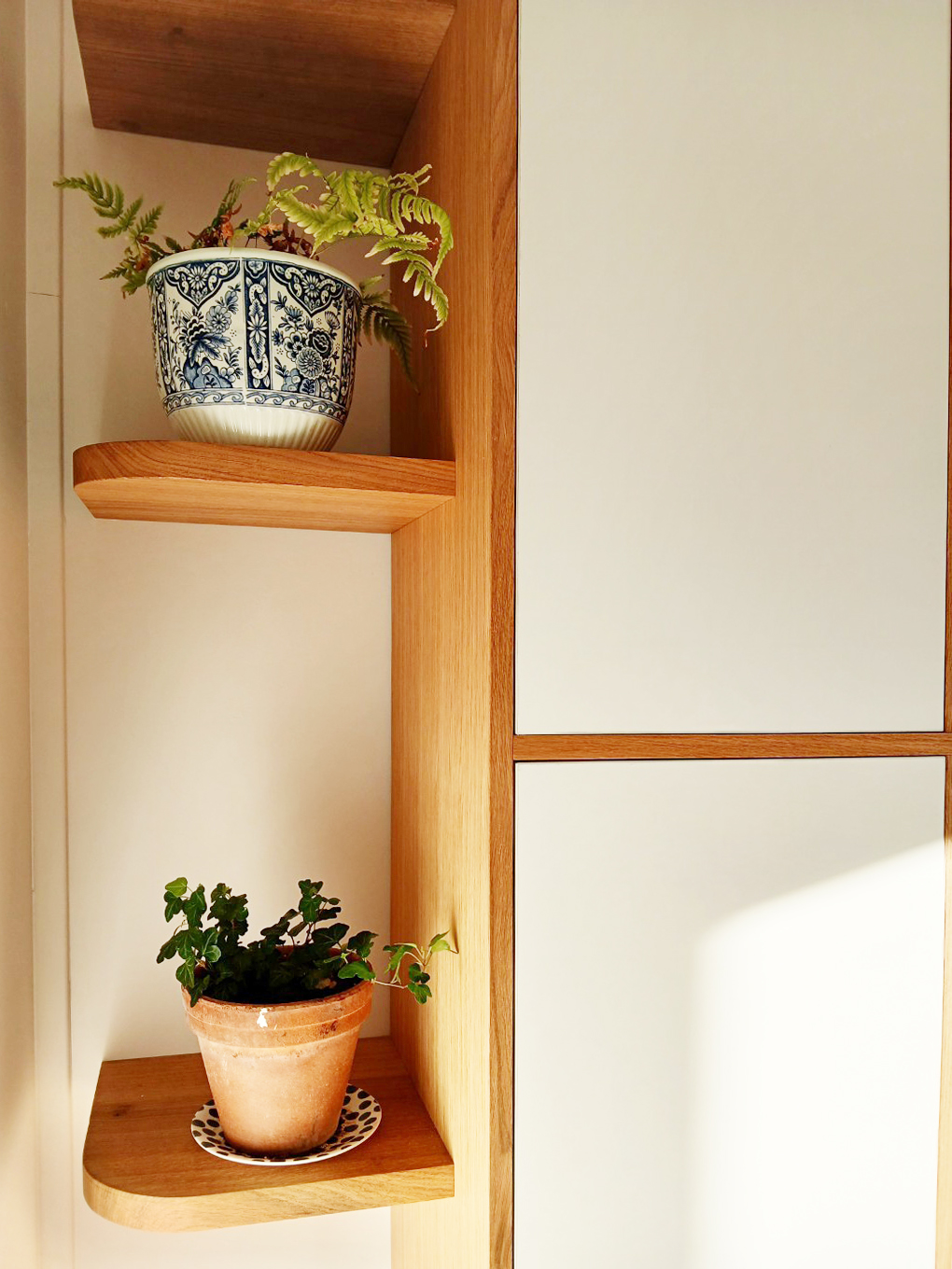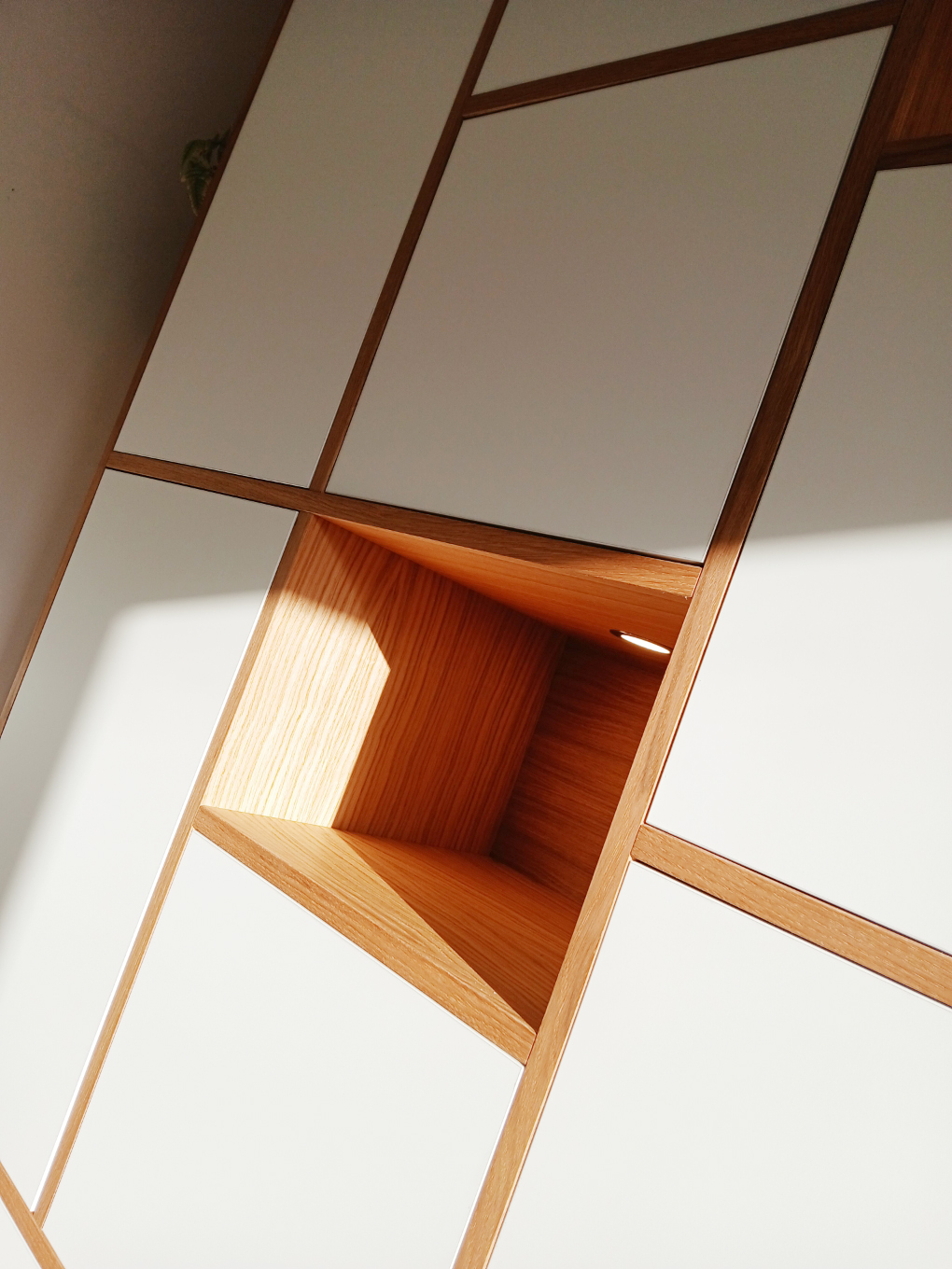 Les côtés de la partie basse du meuble sont cintrés, et des étagères arrondies ont été placé de part et d’autres des côtés de la partie supérieur du meuble. Des spots ont été intégrés dans les niches en chêne.