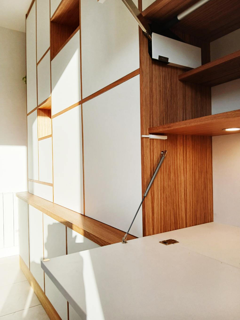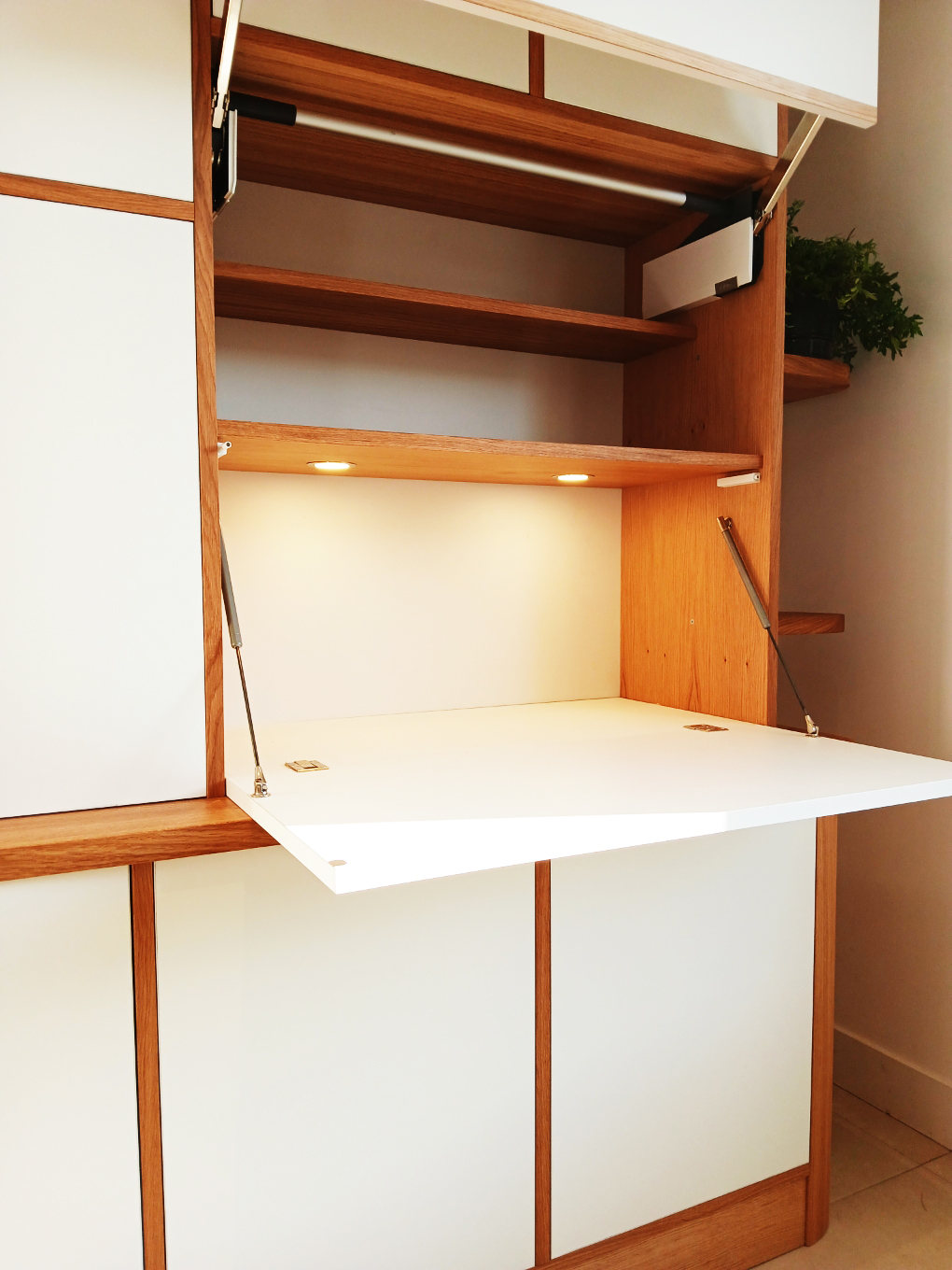 Meuble de salon en chêne, portes en Soft-touch blanc.