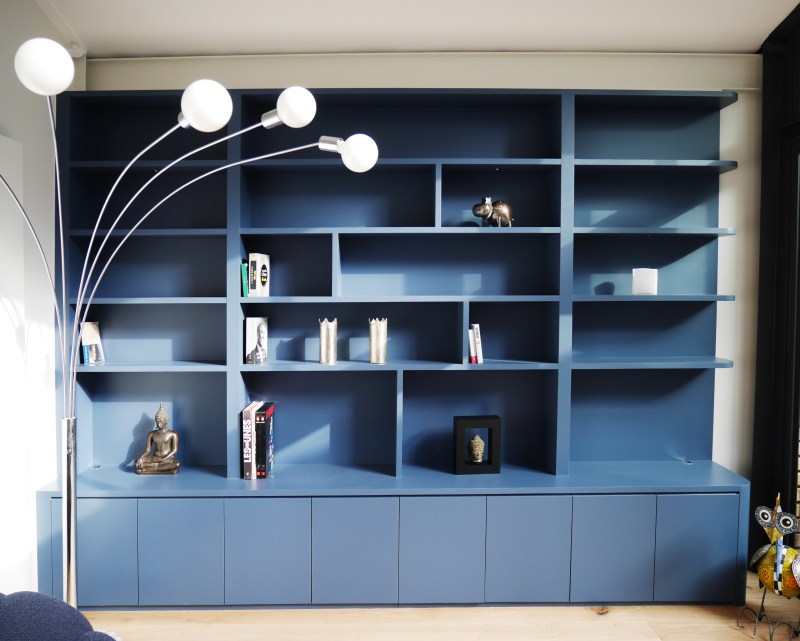 Bibliothèque en médium peint avec angle droit arrondi. Placards en partie basse. Intégration de spot dans l’épaisseur de certaines étagères. D.A. : Clémence Michaelis