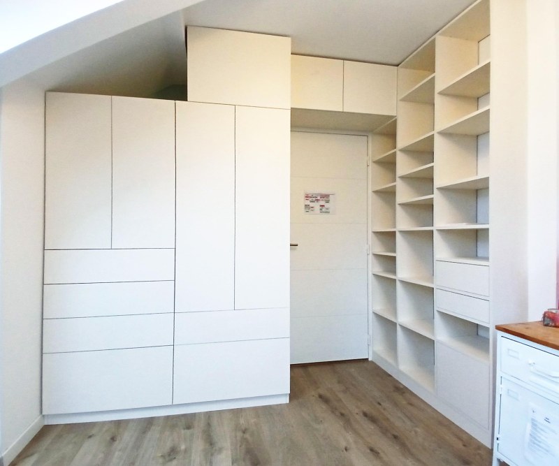 Réalisation d’un dressing bibliothèque qui encadre la porte d’entrée. Réalisation en mélaminé crème.