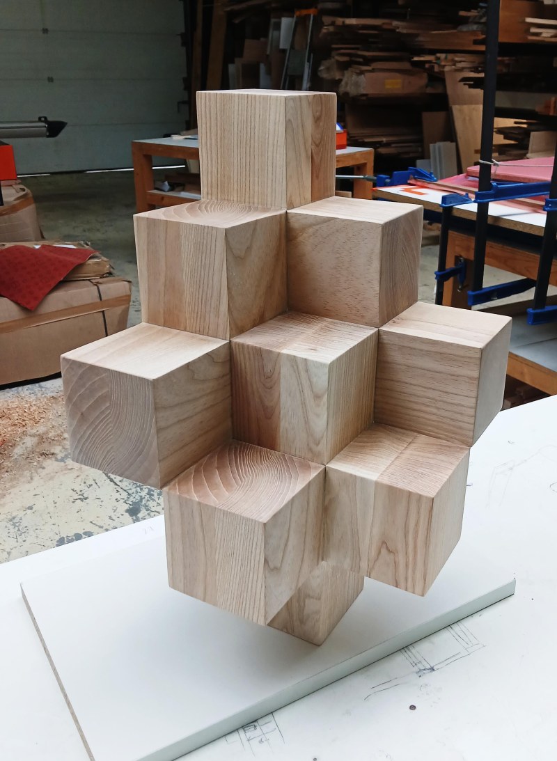 Petit meuble déco en frêne massif, à accrocher dans un angle. Les plateformes font 10 par 10 cm.